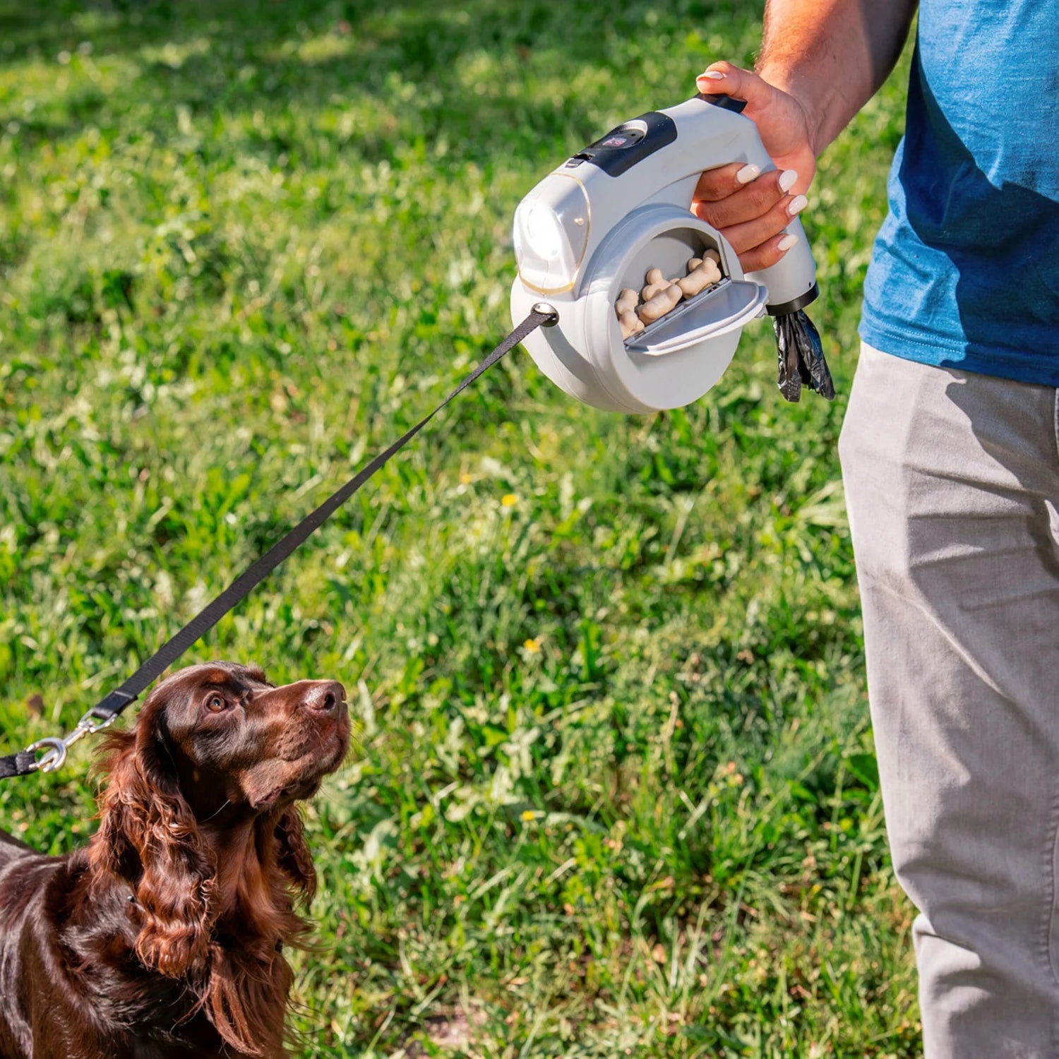 Água, snacks, luz, bolsas e controlo, tudo integrado. O teu cão feliz e tu, mais confortável do que nunca